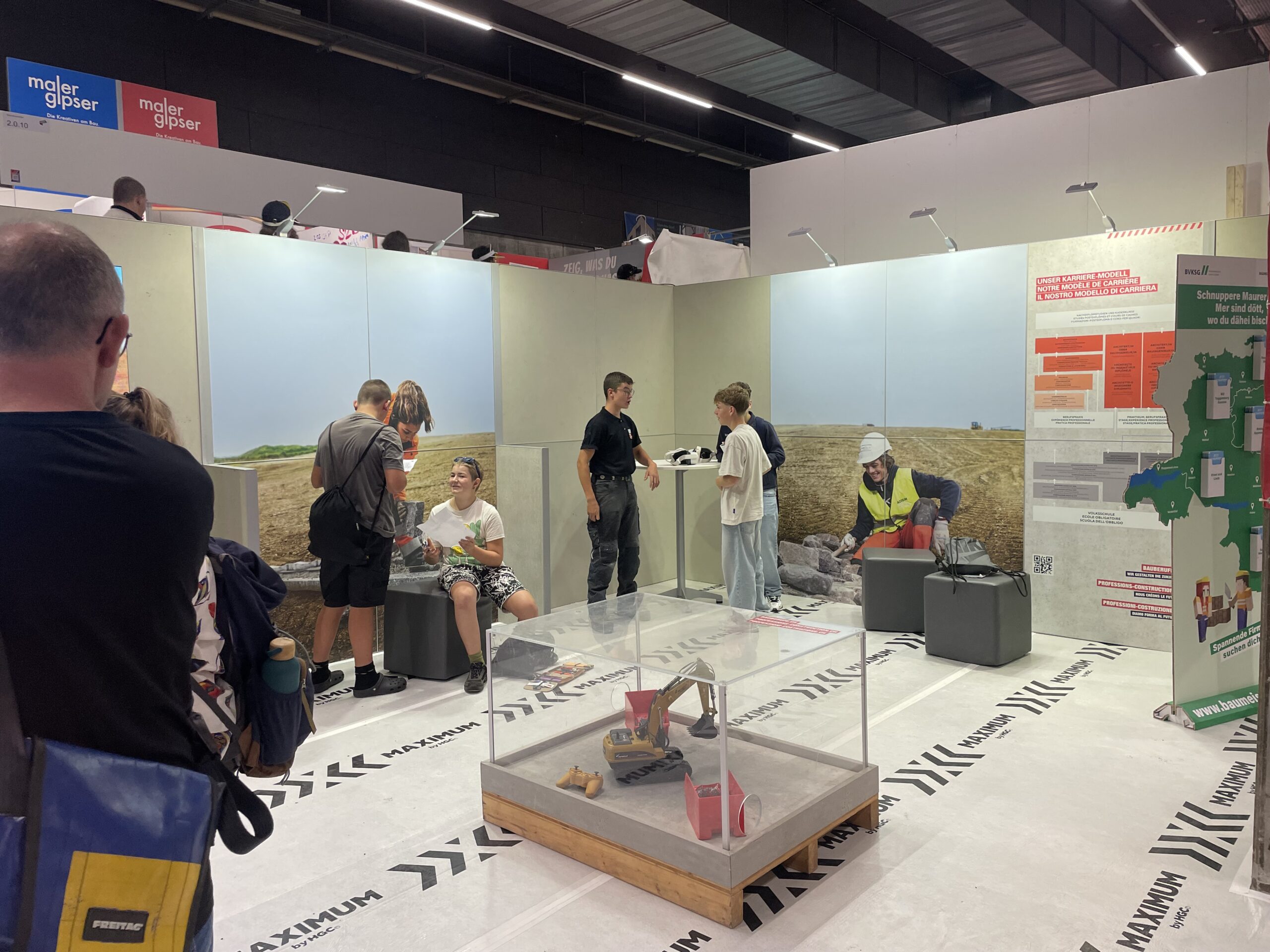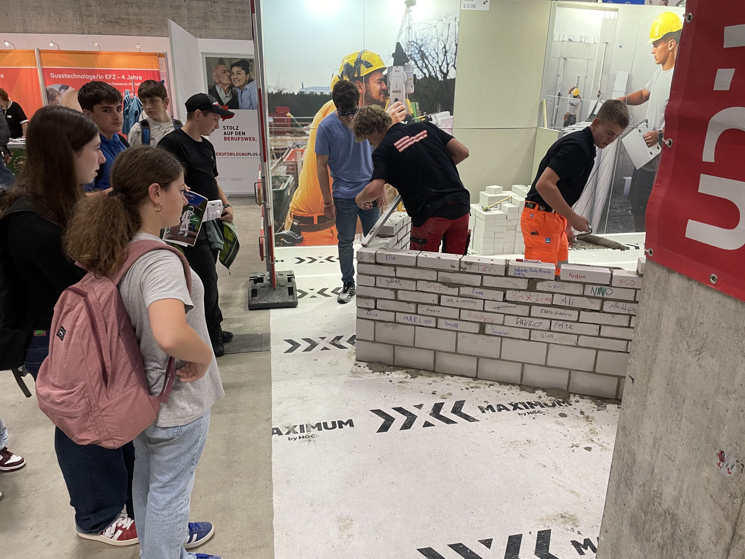 Mit verschiedenen Aktivitäten, unter der Leitung der Berufsbildner üK der Maurerlehrhalle Gossau, wurde versucht, sich von anderen Berufsbildern abzuheben. Sehr erfolgreich war das Publikumsmauern! Jung und Alte versuchten sich als Maurer und verewigten sich mit Namen auf den vermauerten Kalksandsteinen. Eine weitere Attraktion waren die VR-Brillen, die Einblick in den Baustellen-Alltag boten. Ausserdem konnten die Besucher ihre Geschicklichkeit im Umgang mit einem ferngesteuerten Bagger prüfen und sich ein kleines Geschenk ergattern.